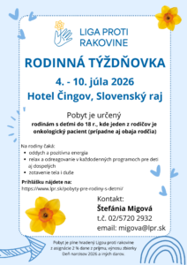 Liga proti rakovine zabezpečuje a plne finančne hradí projekt „RODINNÁ TÝŽDŇOVKA“ určený rodinám, v ktorých aspoň jeden z rodičov je onkologický pacient. Aj tento rok opäť pripravujeme pre rodiny s deťmi do 18 rokov nezabudnuteľný týždeň plný oddychu, zábavy, zážitkov a nových priateľstiev. Cieľom je, aby rodiny v neľahkej životnej situácii mali možnosť nájsť cestu k nadobudnutiu síl a inšpirácie pre návrat do bežného rodinného života. Už len stretnutie sa rodín, ktoré zažívajú rovnaké problémy a poznajú dôverne situáciu, ktorú so sebou náročné ochorenie prináša, je pre nich veľmi dôležité a prínosné. Pripravený je sprevádzajúci štáb – psychológovia a dobrovoľníci, pomáhajúci ako animátori, ktorých snahou je priniesť do života rodín opäť radosť a pohodu.